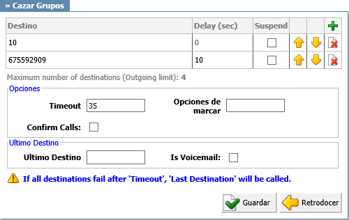 Este servicio envía la llamada a todos los destinos configurados de forma simultanea. Si la llamada no es atendida por ninguna de las extensiones configuradas, la llamada se transfiere a la extensión «Último destino», que puede ser un Buzón de Voz si se selecciona la opción «Is Voicemail».