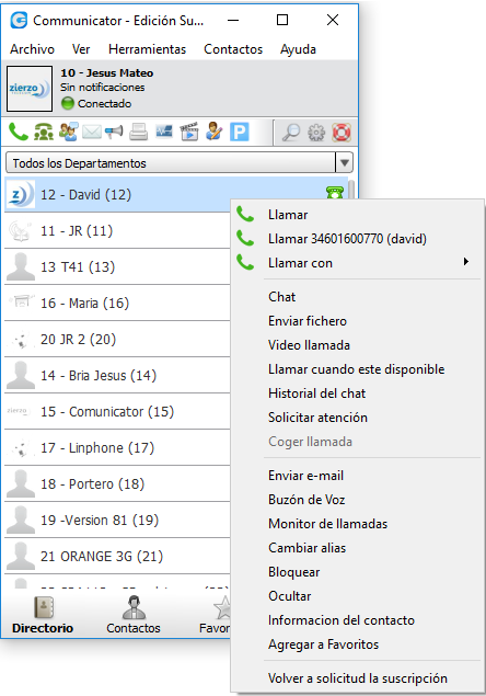 Al hacer clic con el botón derecho del ratón en un nombre de contacto se pueden realizar más acciones con respecto a la extensión seleccionada.
