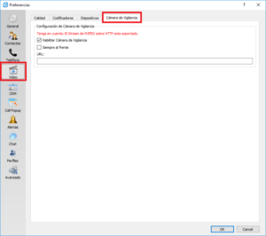 Abre una vista previa de la cámara de vigilancia. Esta opción sólo está disponible si tiene la cámara de vigilancia configurada con su dirección IP en Herramientas –> Preferencias –> Vídeo –> Cámara de vigilancia.