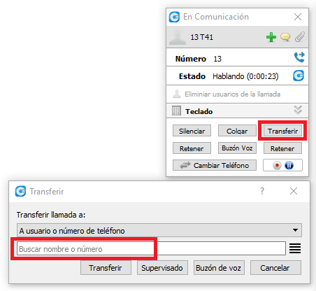 Transferir a otra llamada en curso: Si un usuario tiene 2 o más llamadas activas, puede transferir las llamadas de una a otra. Ejemplo: un usuario de Communicator está hablando con Pablo. Recibe una llamada de Silvia mientras habla con Pablo. El usuario de Communicator ahora puede añadir a Silvia a la llamada existente con Pablo y los 3 participantes se escucharán entre sí.