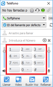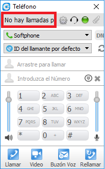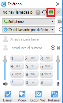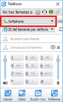 • En el módulo Teléfono puede ver qué modo de teléfono está configurado por defecto (Softphone – Teléfono Fijo). Si en la configuración ha habilitado ambos modos (DeskPhone y Softhpone), puede hacer clic en el desplegable y podrá cambiar a otro modo. Junto a este desplegable hay un icono DND con la opción de establecer su estado como «No Molestar». Esta funcionalidad debe de estar habilitada para su funcionamiento. Consulte con su administrador.