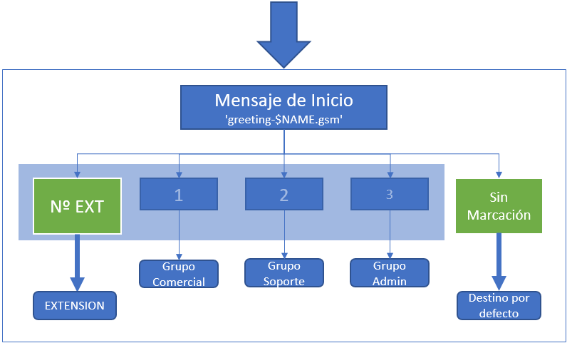 • Destino por defecto si no se pulsa tecla: Transfiere la llamada a un destino por defecto si no se pulsa ninguna opción.